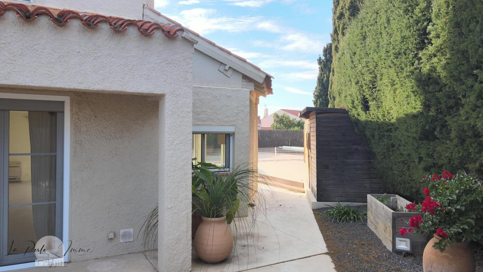 Dès l’entrée, un portail électrique ouvre sur une allée permettant de stationner aisément 3 véhicules au sein du jardin soigné.