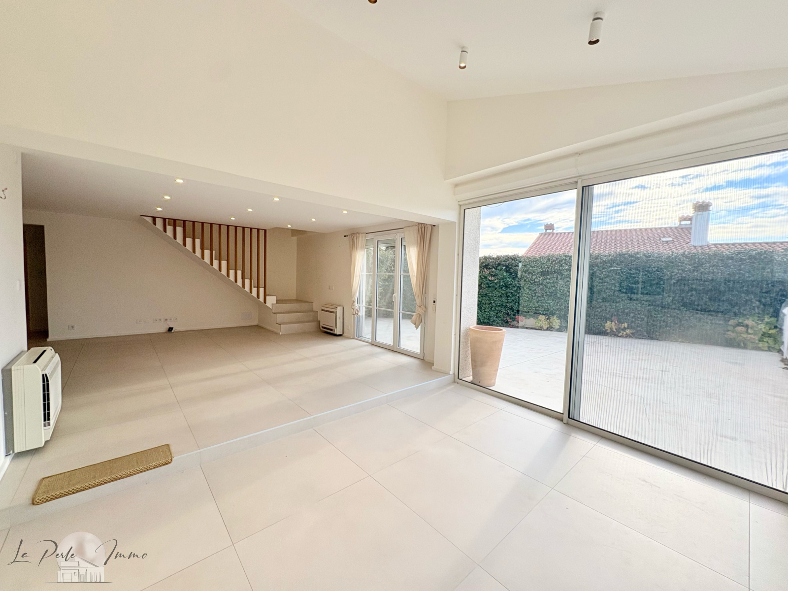Un hall d’entrée dessert une pièce de vie exceptionnelle, composée d’un immense séjour – salle à manger – cuisine ouverte, baigné de lumière grâce à ses grandes baies vitrées aluminium double vitrage avec volets électriques. L’intérieur se prolonge naturellement vers l’extérieur, offrant une sensation d’espace remarquable.